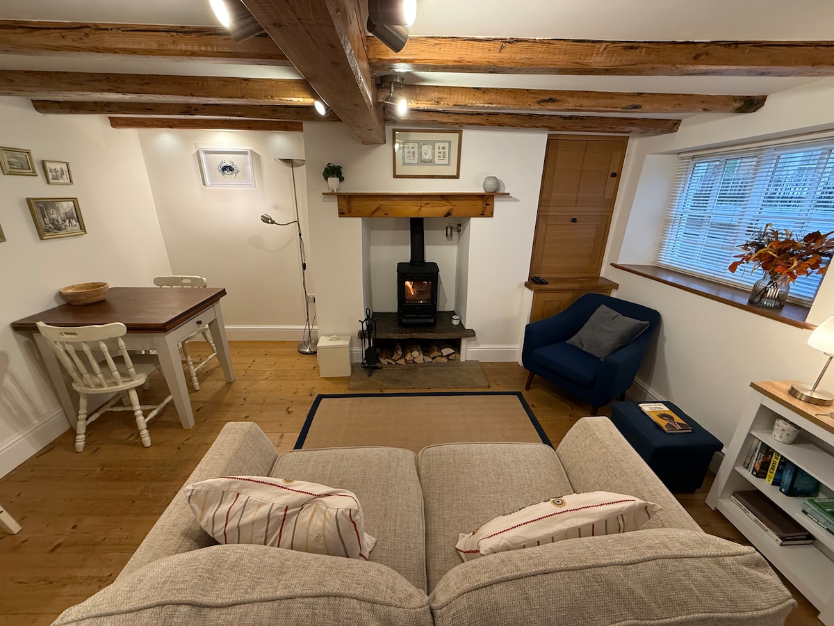 ¡Una experiencia única de autoservicio! Alójate en tu propia casa de campo privada privada de lujo en casa, adjunta a nuestra propiedad construida en 1560 frente a la plaza del mercado. Su propia entrada privada conduce a su propio comedor y área de cocina que conduce a su propio gran salón separado. Un cuarto de ducha bien equipado está situado en la planta baja. Arriba hay un gran dormitorio con armarios empotrados y TV.