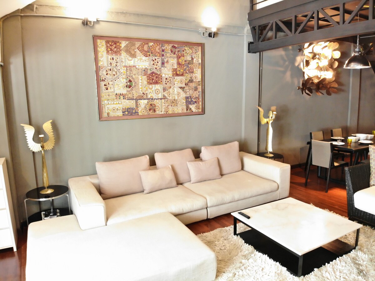 Suite de tamaño familiar: puede alojar hasta 8 personas. Alójate en un apartahotel con 3 dormitorios y 3 baños y bañera con amplia sala de estar y cocina de opción completa. La habitación tiene diseños de loft industriales, con ladrillo visto y sofá de cuero. Situado en el distrito comercial de Waroroj de la ciudad de Chiang Mai, cerca de todo, comida callejera, restaurantes, bares. A pocos pasos del río Ping, la ciudad china y el mercado de frutas. Disfruta del WIFI de alta velocidad