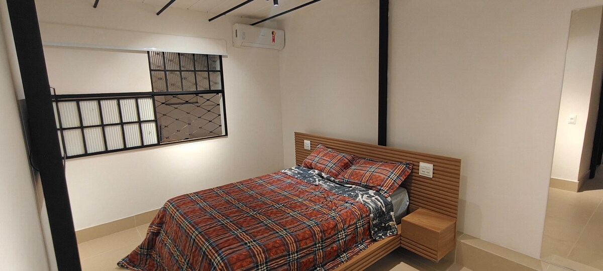 Edificio estudio, con sala de estar/dormitorio interconectado con cocina, baño nuevo con caja de blindex y un balcón con hermosas vistas. Está a 4 cuadras del CEFET, cerca de las "Expominas" y del Hospital Sarah Kubistchek. Ambiente seguro y familiar porque está en la parte trasera de mi casa, y puedes contar conmigo para cualquier eventualidad. Todo nuevo, colchones, sábanas, almohadas, Smart TV de 32 ", internet, wifi, lavadora, batidora, cafetera eléctrica, etc. Garaje compartido conmigo.