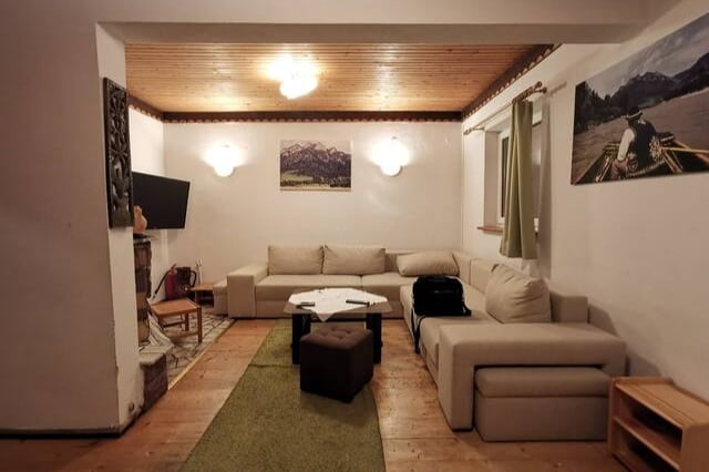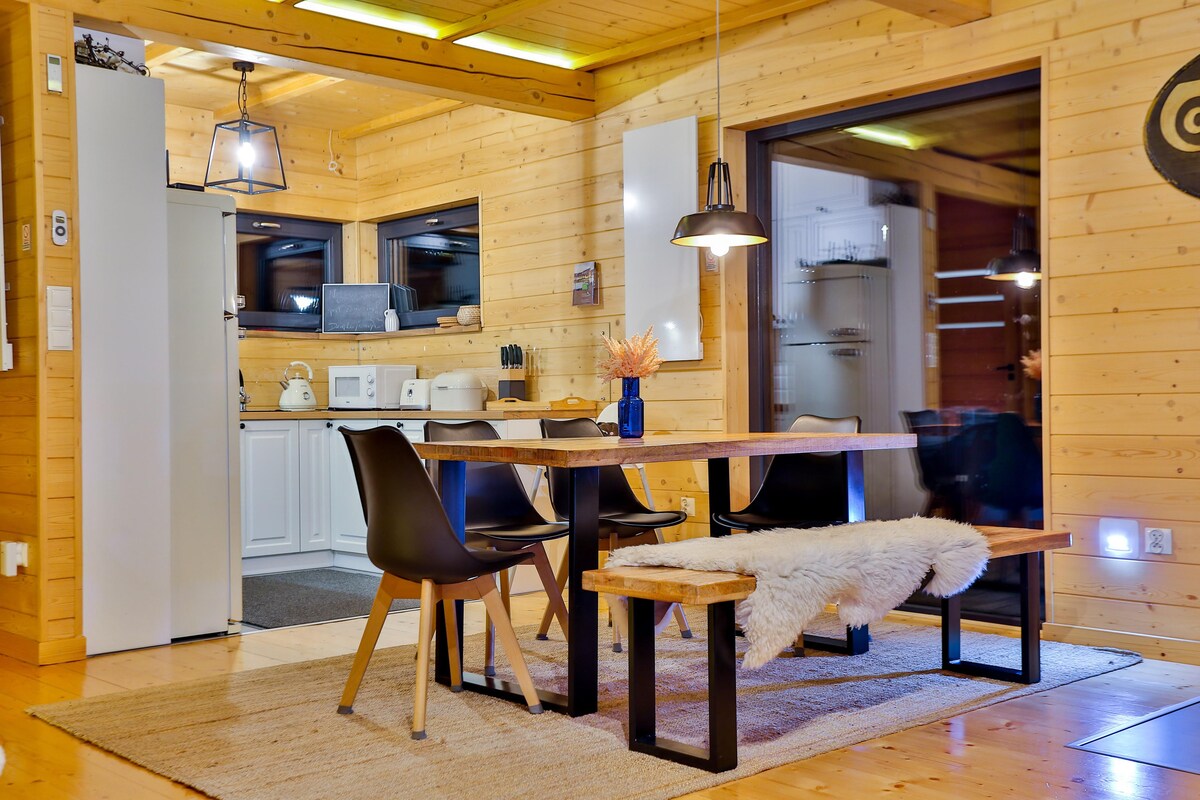 Comfortable 103 m² wooden two-storey house with a garage, fully furnished. Features a living room with fireplace, terrace and dining area, 2 bedrooms upstairs (double bed + twin beds, both with balconies), an additional bedroom with sofa bed, 2 bathrooms, and a toilet. Fully equipped kitchen with fridge, induction cooktop, washing machine, tiled stove, and dining table. Ideal for families and groups.