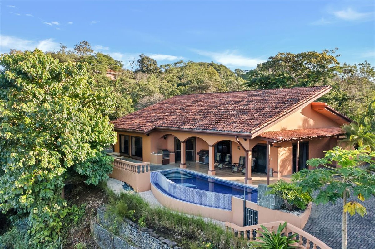 Hermosa casa contemporánea con vistas al mar y la montaña, internet de 100 Mbps y piscina infinita privada. Propiedad amplia, cerrada con muro perimetral y portón eléctrico para mayor privacidad y seguridad. A solo 450 metros caminando de la playa. Ideal para descansar, disfrutar o trabajar remoto en un vecindario tranquilo. A 5 minutos en auto o 20 caminando del centro de Playas del Coco, con fácil acceso a restaurantes y actividades. Aeropuerto de Liberia a 24 km.