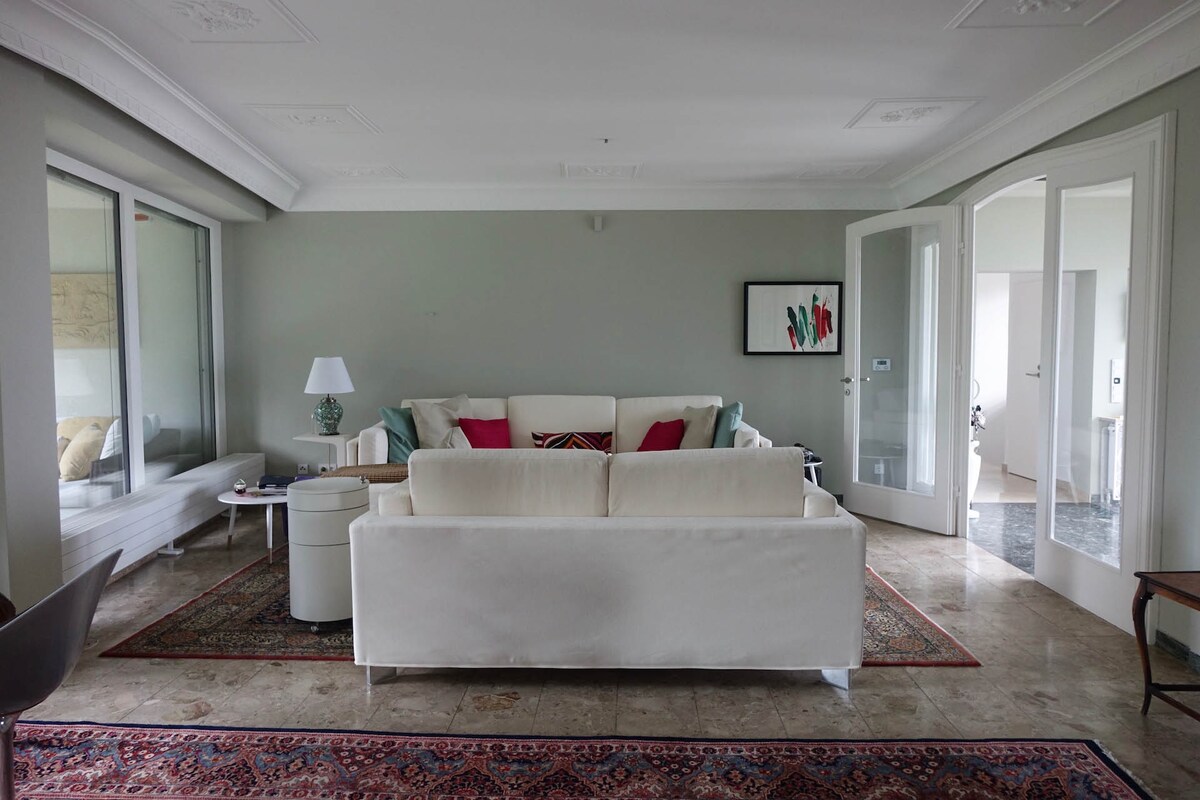 Bienvenido a un apartamento amueblado de alta calidad (120 m2 ) en el corazón de Grinzing, el distrito más elegante de Viena. Amplio, tranquilo y luminoso apartamento con sala de estar de 60 m2 amueblada con sofá de Rolf Benz, lámparas de diseño, grabados de arte. Si quieres aire fresco, decide por el balcón con cafetería o la terraza techada con salón, donde puedes experimentar la puesta de sol. Esquina de oficina, wifi rápido Desde esta ubicación encontrarás fácilmente el destino que deseas a casi todos los lugares turísticos.
