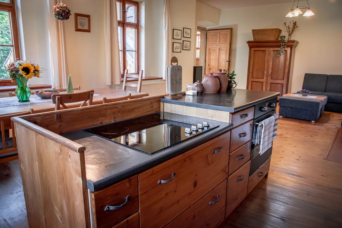 Apartamento 77, Loučná nad Desnou, Jeseníky. Cama matrimonial, cama supletoria para 2 personas. Cuna. Baño con inodoro, bañera. Cocina americana totalmente equipada. Todos los platos, horno de aire caliente, nevera, congelador, cocina de inducción, microondas. Wifi , TV y estacionamiento gratuito. Posibilidad de guardar bicicletas, esquís o cochecitos de bebé en un espacio cerrado con llave. Todas las áreas son para no fumadores.
