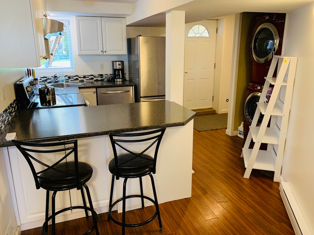 Luminosa, actualizada y limpia suite de 2 dormitorios. Cocina completa con lavavajillas y lavandería en la suite. La cocina está equipada con todo lo necesario (cubiertos, platos, platos, tazas, tazas, vasos, cafetera, etc.) ¡El vecindario es un encantador y tranquilo bolsillo en medio de todo! Nota adicional: esta es una suite en la planta baja de nuestra casa, por lo que puedes escuchar los pasos de nosotros viviendo en la parte del piso principal de la casa.
