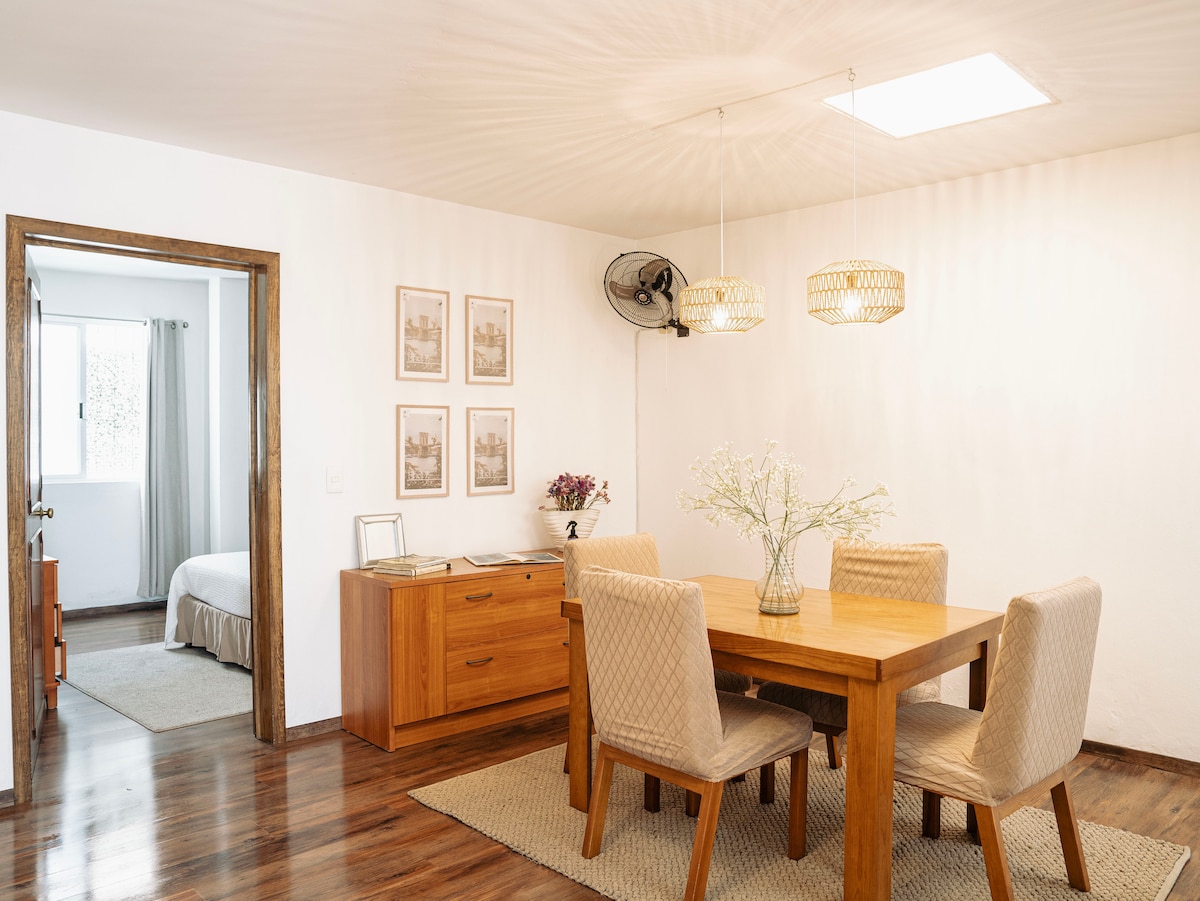 Increíble departamento de un solo piso, estilo étnico contemporáneo, piezas artesanales complementan su original decoración. Diseñado para ofrecer a sus huéspedes una estancia cómoda, funcional y acogedora. Tiene todo lo necesario para hacerte sentir como en casa, con dos encantadoras habitaciones equipadas con camas queen size, sala comedor, baño, cocina equipada y un amplio estacionamiento. Ubicado en un barrio muy tranquilo, a 10 minutos en taxi del centro de la ciudad o 40 minutos caminando.