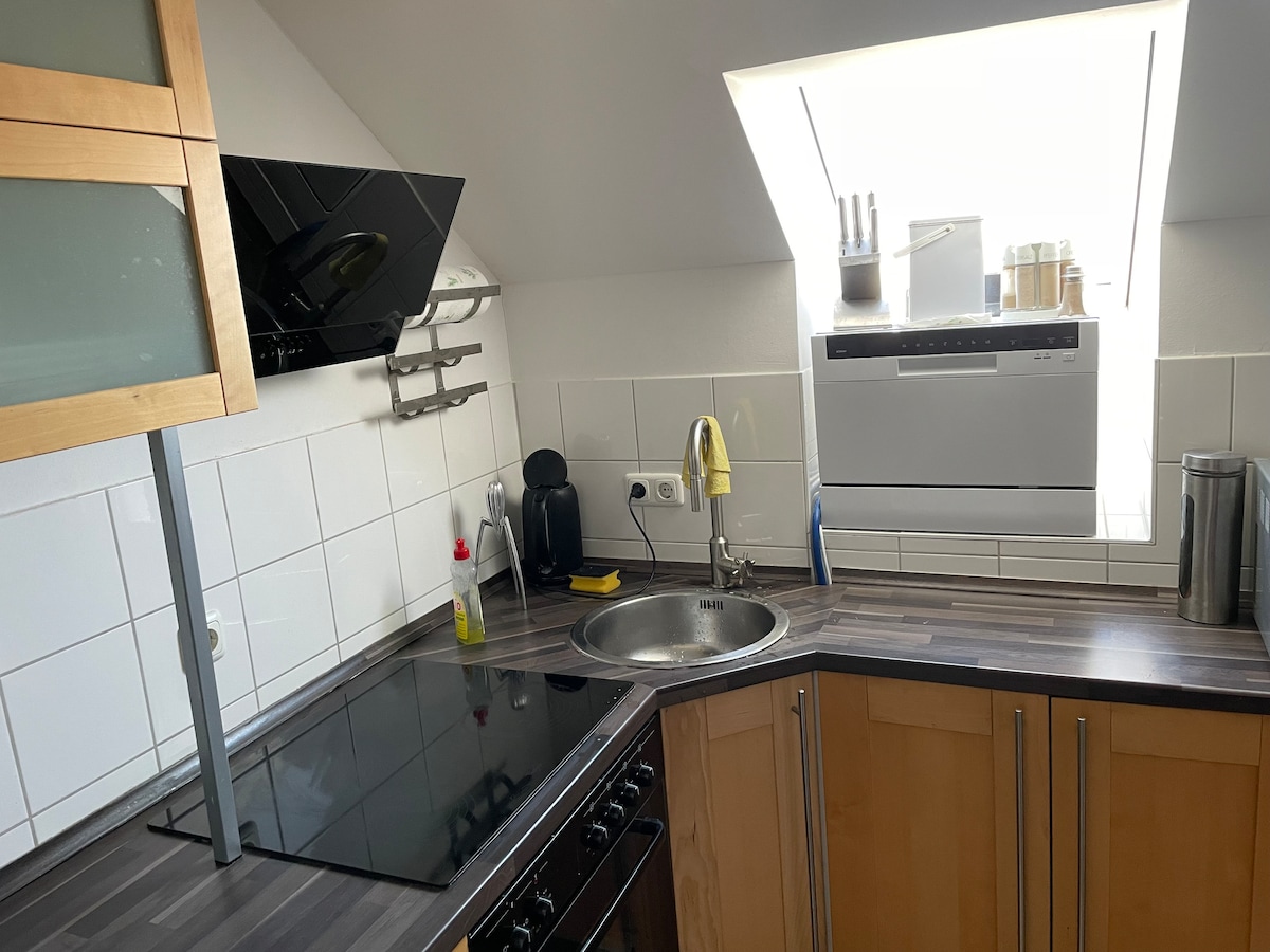Es un apartamento ático de 80 m² en 2 niveles (1ª planta: pasillo, armario, armario empotrado, baño con ducha/WC, 2ª planta: loft con cocina completa, bar, mesa de comedor, sofá (o sofá cama), escritorio, chimenea, cama doble, baño (WC/bañera/lavadora) y cama plegable si es necesario. Monobloque Klimabox. Barrio tranquilo y residencial justo al borde del bosque. Aparcar siempre es fácil en todas partes. S-Bahn a 7 min a pie o 1 min en autobús. A 15 min en coche de Marienplatz.