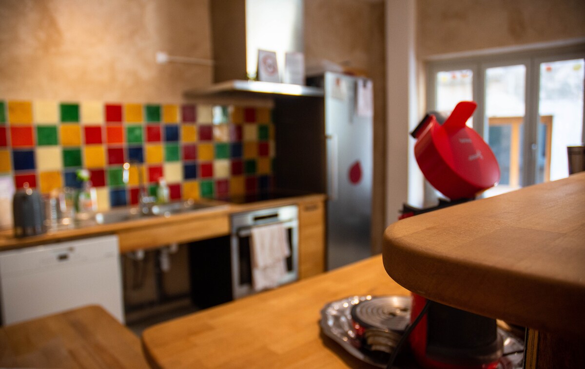 Cama en dormitorio mixto de 8 plazas, con 4 literas, taquillas cadenazables, en la 3ª planta, cuarto de baño compartido frente al dormitorio, vistas a la iglesia del pueblo, balcón, cerca de la torre del reloj, wifi, sin TV. El dormitorio está climatizado. La gran sala, decorada con murales que datan de finales del siglo XIX, está a su disposición, con su cocina equipada y su zona de relajación. Nuestros amigos los animales no pueden entrar en el albergue.