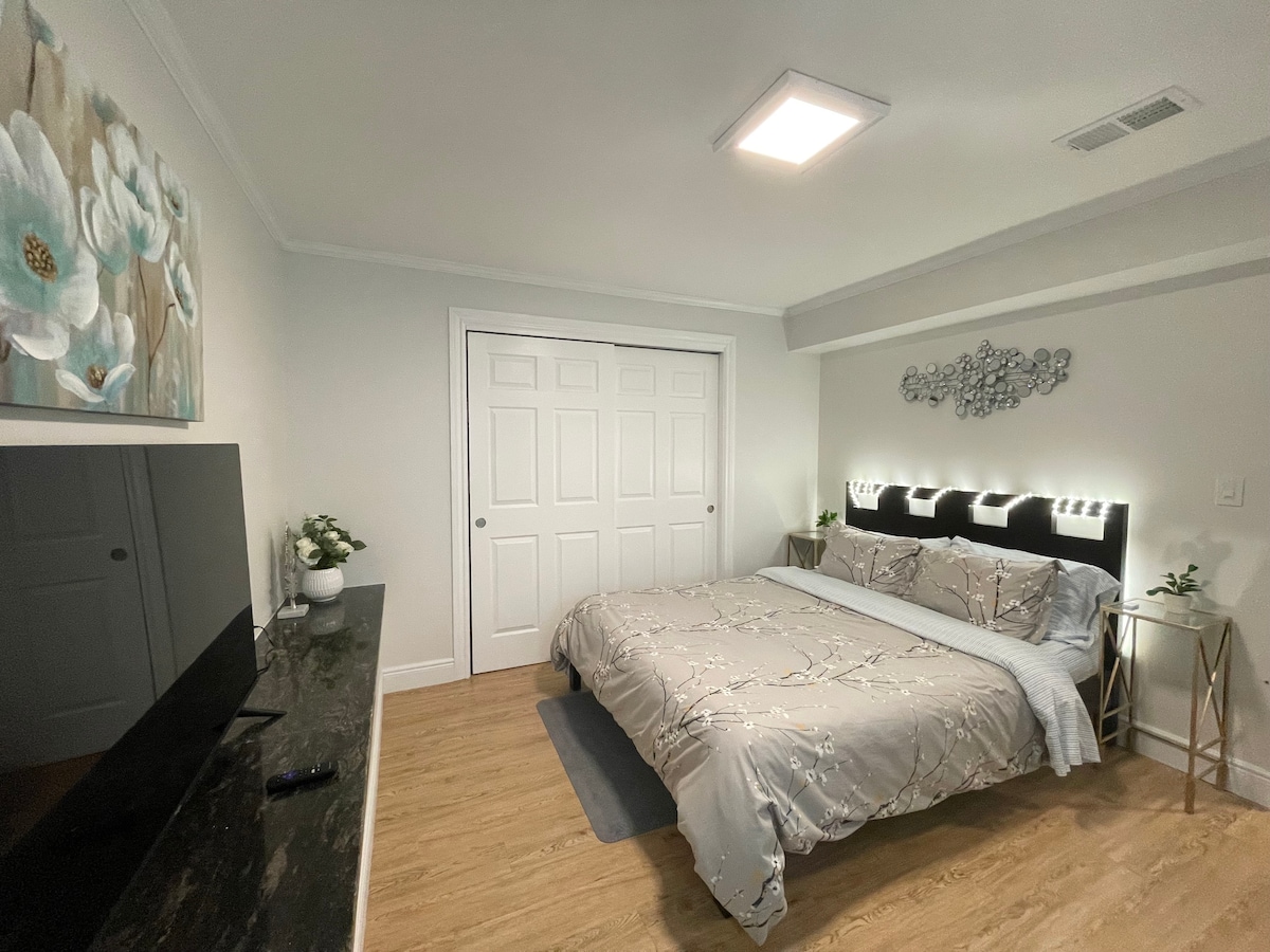 Esta es una suite espaciosa con baño privado y mostrador. Esta habitación está en la parte trasera de nuestra casa, detrás del garaje, con la ventana hacia la pared. Tiene una cama tamaño queen donde pueden dormir dos personas. También está equipada con un mostrador privado. Mi marido y yo vivimos arriba, pero tienes tu propio acceso privado abajo a tu habitación después de entrar por la puerta principal.
