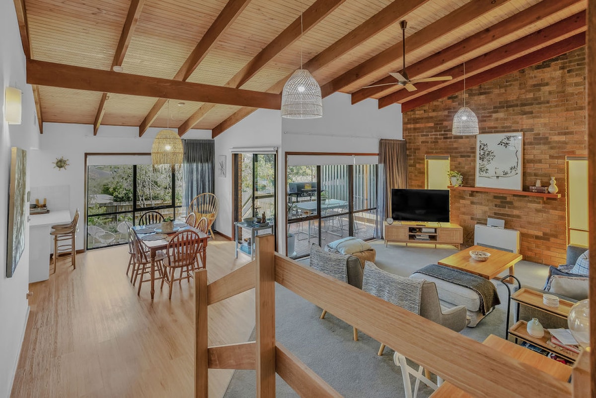 The Vibe: A dog friendly space, surrounded by beautiful established gardens in a quiet riverside cul-de-sac. This much loved home offers hot tub, yoga pagoda and huge outdoor entertaining and play spaces. Hidden away from the bustle of summer tourism you’ll never be short on things to do here -slip on your walking shoes, jump on a bike (10 min to Main Street) or enjoy a walk along the Barwon River at end of the road. Native birds and bush trails abound. It’s your ultimate indulgent escape.