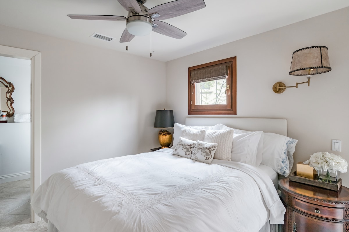 Siéntate en el patio trasero y luego entra para disfrutar de las vistas frondosas desde una sala de estar con triple orientación. El apartamento tiene un ambiente de casa de campo con jardineras y accesorios de madera. Una planta colgante y sábanas blancas proporcionan una sensación de calma. Despiértate con el canto de los pájaros y explora nuestro 1/2 acre de árboles frutales, huertos y paisajes. Sin embargo, la mayoría de las atracciones de San Diego están a solo 5 a 10 millas de distancia. La nueva cocina está incluida en tu espacio para que puedas preparar tus propias comidas si lo deseas. El equipo de cocina incluye un horno tostador de convección, cafetera, olla caliente, microondas y placa de inducción, ollas y sartenes, utensilios de cocina, cubiertos y platos. También ofrecemos café, té, azúcar, sal y pimienta, aceite para cocinar y hielo. Este espacio está unido a nuestra casa principal, pero tendrás tu propia entrada independiente y cocina privada/ sala de estar, cama y baño. Nos encantaría saludarte y mostrarte los alrededores cuando llegues, pero si no podemos, tendrás tu propio código de puerta único para entrar. Hemos preparado una carpeta de información para los huéspedes y podemos ayudarte a planificar el mejor uso de tu tiempo. Sin embargo, si prefieres estar solo, también nos parece bien. Hemos caminado hasta el centro de la ciudad o hasta el tranvía más cercano, pero a menos que seas un caminante y salgas a hacer ejercicio, probablemente querrás un coche. Ahora hay muchas bicicletas disponibles para alquilar, pero será cuesta arriba para volver a la casa. Algunos de nuestros huéspedes han optado por depender solo de Uber, en cuyo caso la entrega de comestibles y/o comidas es útil. Si tienes un vuelo por la tarde o por la noche, puedes guardar el equipaje en nuestra casa después de la salida a las 10:00 a. m. Estamos en una zona residencial montañosa con tiendas, restaurantes y acceso a autobuses/tranvías a unas 2 millas de distancia, por lo que tendrás la mayor flexibilidad si vienes en coche. Si eliges Uber, puedes pedir comestibles o comidas para llevar.