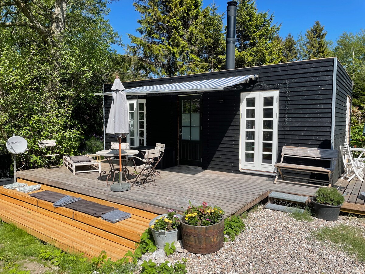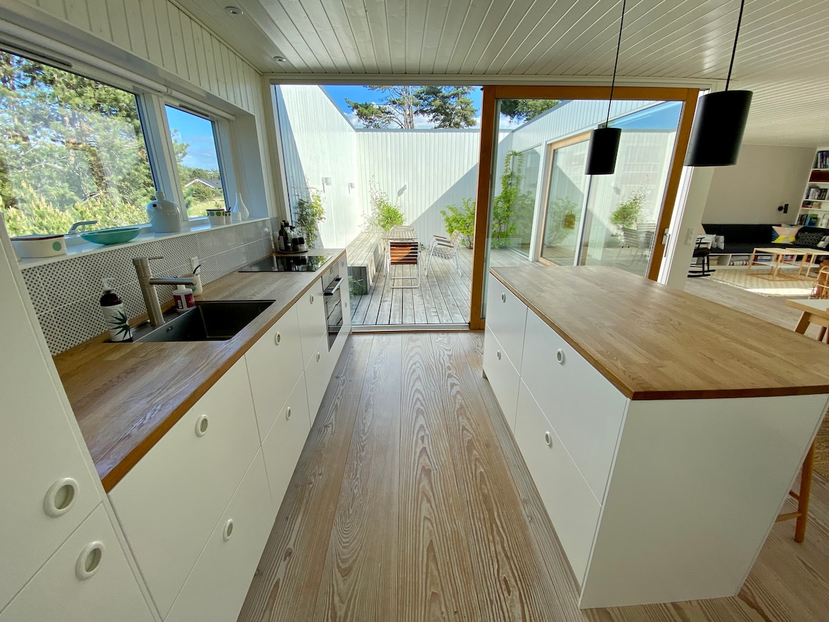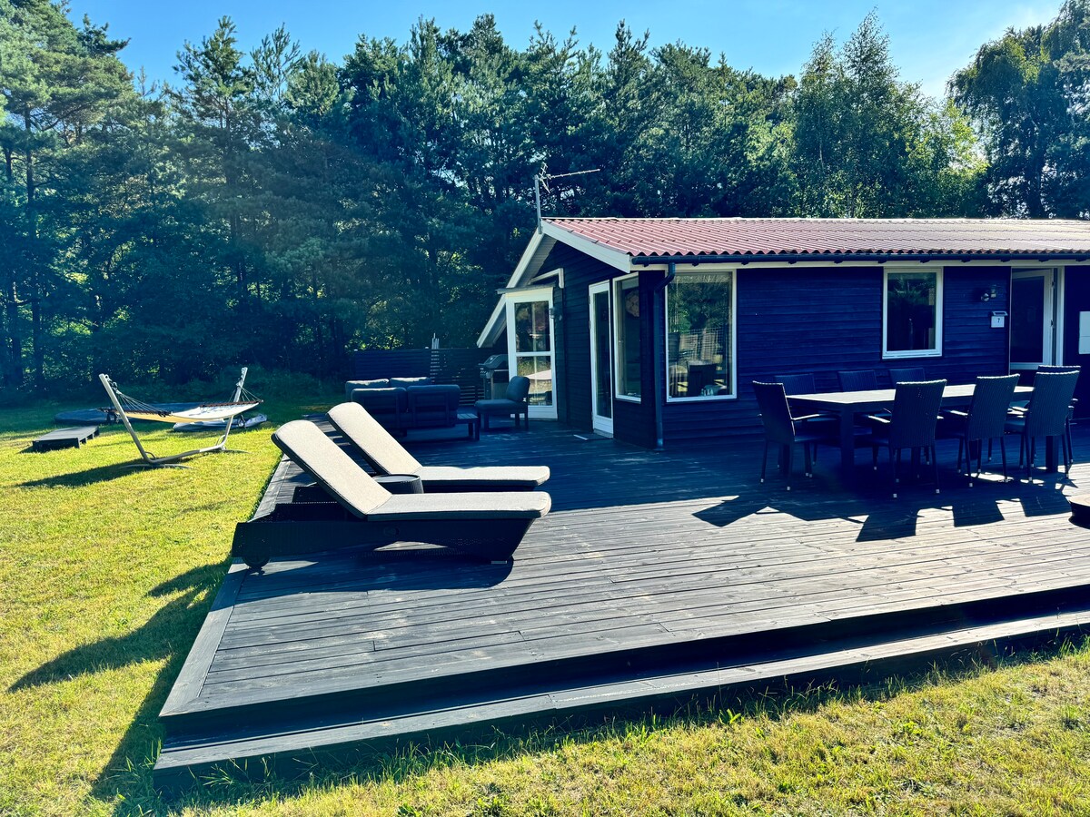 Welcome to our forest retreat 🌲 We’re Cecilie and Gustav This modern 120 m² cabin sits on a large private lot and sleeps up to 12 guests with 5 bedrooms + attic, 6 double beds, and 2 bathrooms Enjoy the open living space, large dining area, and fully equipped kitchen. Outside, relax in the private sauna and wood-fired jacuzzi, or unwind on the terrace surrounded by trees The beach is just 1 km away, offering great balance of forest and sea A peaceful place for togetherness and relaxation
