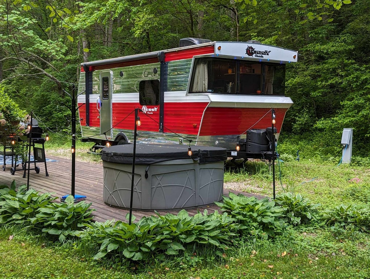 Entra en la escapada de pareja más romántica en el corazón de Hocking Hills Nuestro Airstream de 1974 totalmente modernizado, pero Vintage, emite un fuerte ambiente Dr. McDreamy. Experimenta tu propio cuento de hadas... Imagina esto; sentado en el jacuzzi, brillando con el ambiente romántico de un fuego crepitante, bebes tu bebida favorita. Música sonando, la tranquilidad parece envolver tu alma. Justo cuando crees que no puede mejorar, una estrella fugaz ilumina el cielo nocturno. Pide un deseo 💫