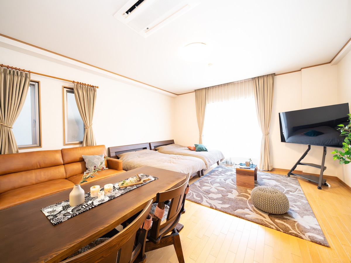 今治市内中心部にあるこちらの宿泊施設はどこに行くにも便利。ゲスト全員が楽しめます。スーパー、銀行、コンビニ、市役所が近くに有ります。すぐ近くに美味しい中華料理屋さんが有ります。 70平方メートルワンルームの広い部屋に、大型テレビでご自身のYouTubeから Wi-Fiを利用してカラオケを楽しむ事が出来ます。 2台のソファーと2台のベッドで寛げます。 フルキッチンで料理も楽しめます。お風呂は浴槽付きシャワーでお寛ぎ下さい♪