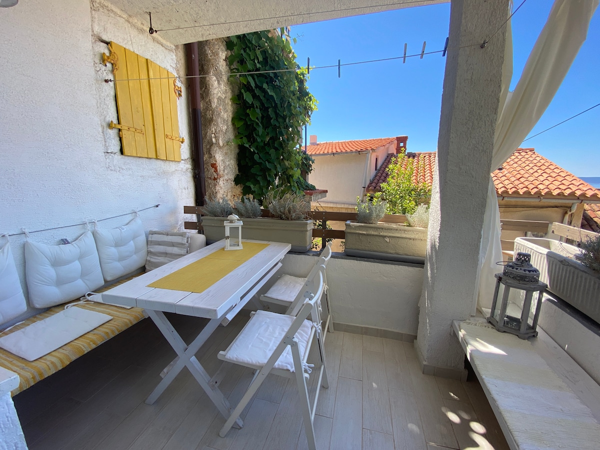 El apartamento (40 m2) está situado en el primer piso, tiene 1 habitación doble, sala de estar con cocina, cama supletoria (sofá) en la sala de estar, baño, terraza muy grande con vistas al mar, TV vía satélite, wifi gratuito, aire acondicionado, calefacción, plaza de aparcamiento. La casa está situada a 200 metros de la playa de guijarros y del centro de la ciudad.