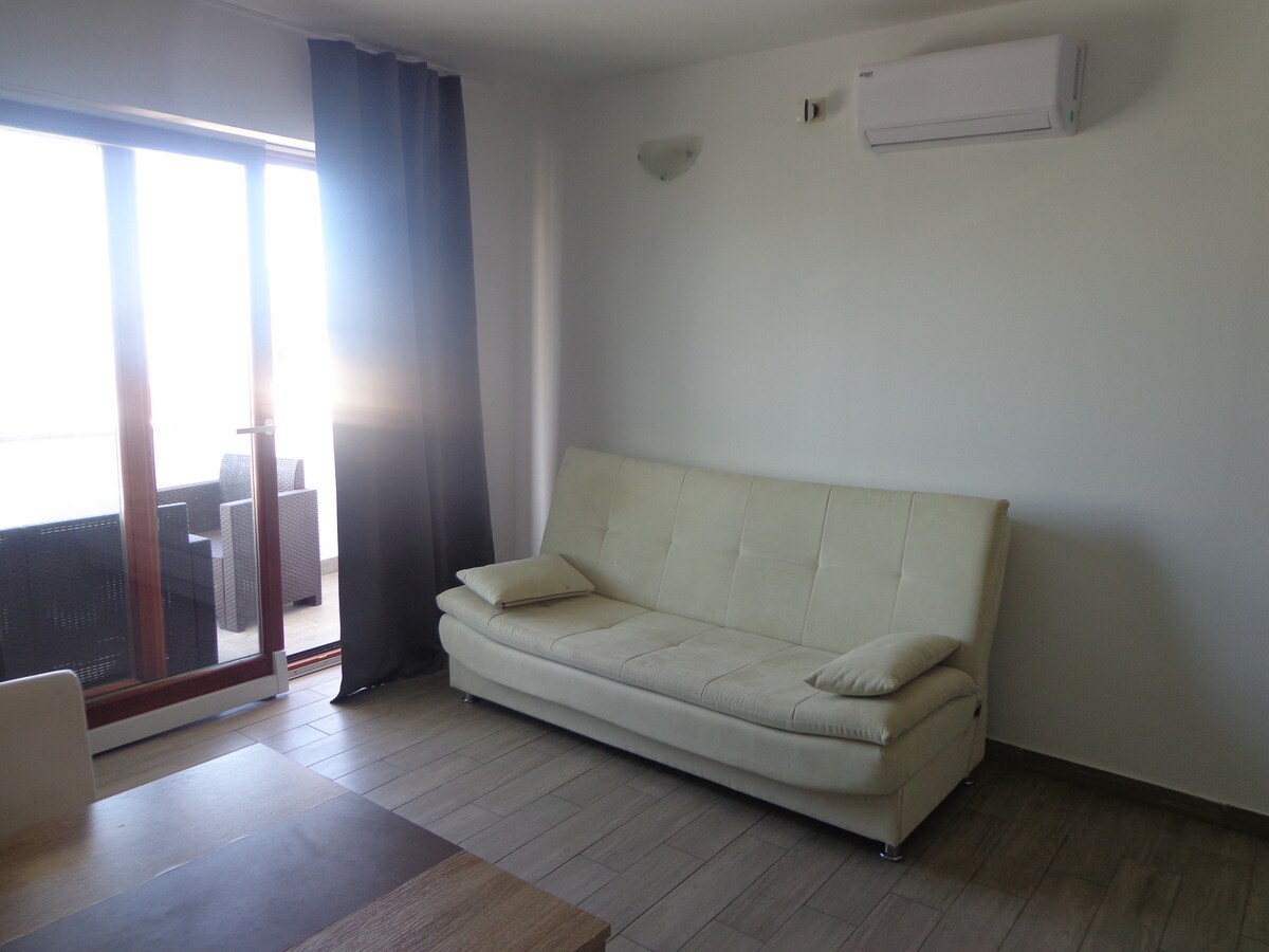 Brand new apartment located near the beach. Decorated in modern style with all necessary equipment (2 TVs, 2 air-conditioners, washing machine, hair dryer, dishwasher, refrigerator, induction stove, oven, coffee/tea machine, safe, mosquito net). You can enjoy huge terrace place (garden furniture, beach loungers). Apartment has free private parking in garage.