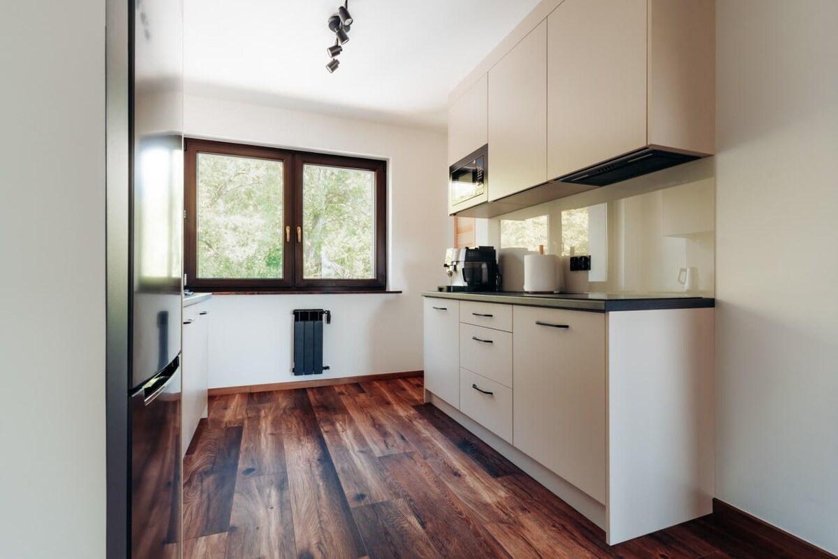 Nuevo apartamento para 4 personas con zona de SPA. Amplio y cómodo apartamento con una superficie de 45 m2 + una zona recreativa de 40 m2 con sauna, bañera de hidromasaje, TV de 75 pulgadas a disposición exclusiva. El apartamento tiene un salón con cocina abierta, un televisor de 65 pulgadas, un dormitorio con una cama y un televisor de 55 pulgadas, un baño y un pasillo. Acceso a Netflix y Amazon Prime.