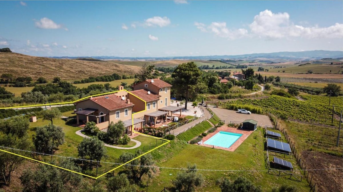 Villa panorámica con piscina, vista a Volterra