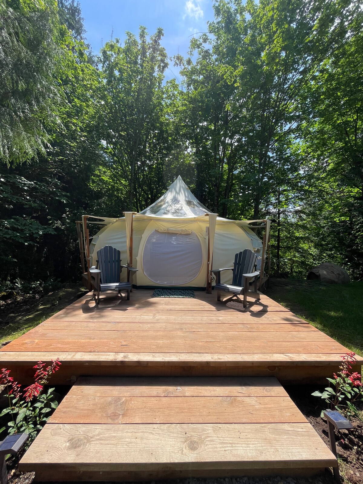 La tienda de Bigfoot, a 12 pies de altura en un bosque antiguo, ofrece una escapada mágica. Un camino iluminado conduce a donde los ciervos a menudo deambulan. Las vistas son tan espectaculares que olvidarás que estás a 10 minutos de Portland. Relájate con un paseo por el laberinto, disfruta de un juego de Cornhole y desconecta en la silla de Sasquatch. Perfecto para aquellos que quieren una escapada tranquila en la naturaleza sin dejar atrás todas las comodidades modernas. Hay una chimenea eléctrica, una nevera, luces y wifi (si es necesario). Te recomendamos que te desconectes. No se permiten fiestas ruidosas :)