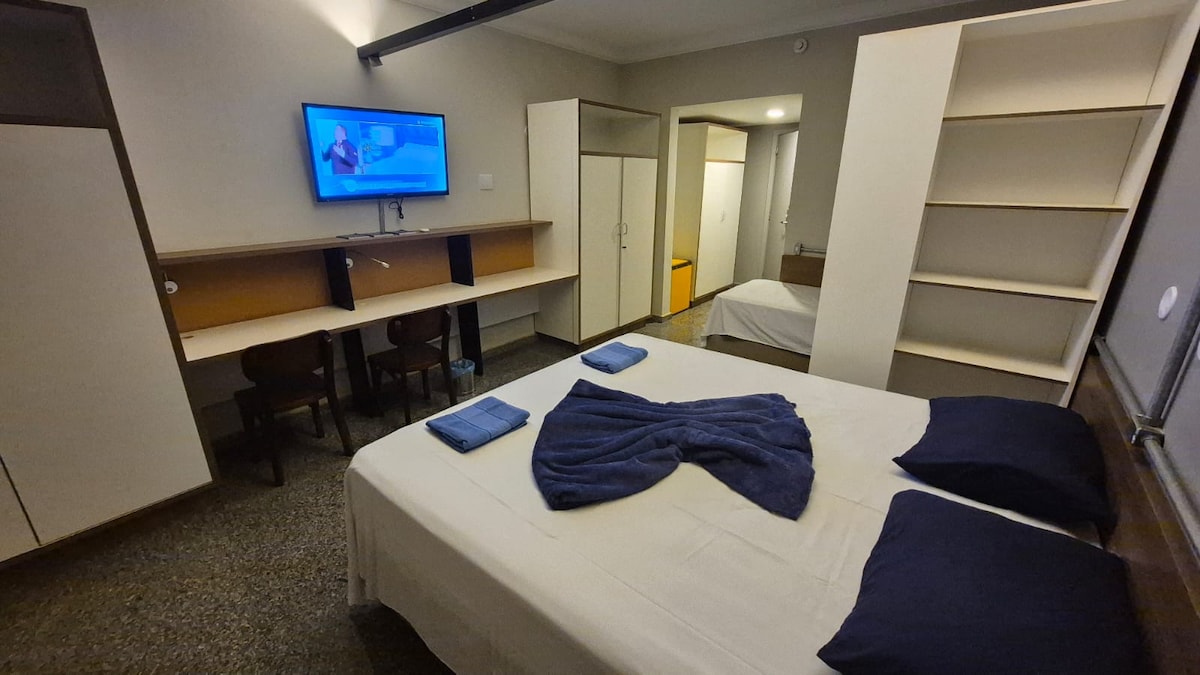 Relájese en este lugar único y tranquilo. Estudio completo con wifi, smart TV, aire acondicionado, Alexa, utensilios de cocina, cafetera, filtro de agua, secador de pelo, plancha y todo lo necesario para su comodidad. Puedes elegir entre 2 camas individuales o 1 cama queen. Disfrute de las áreas comunes como piscina, ascensor, estacionamiento, lavandería, conserjería 24 horas, sala de estudio o reuniones y espacio gourmet. Excelente ubicación, cerca del Hospital São Francisco y Faculdade UNAERP.