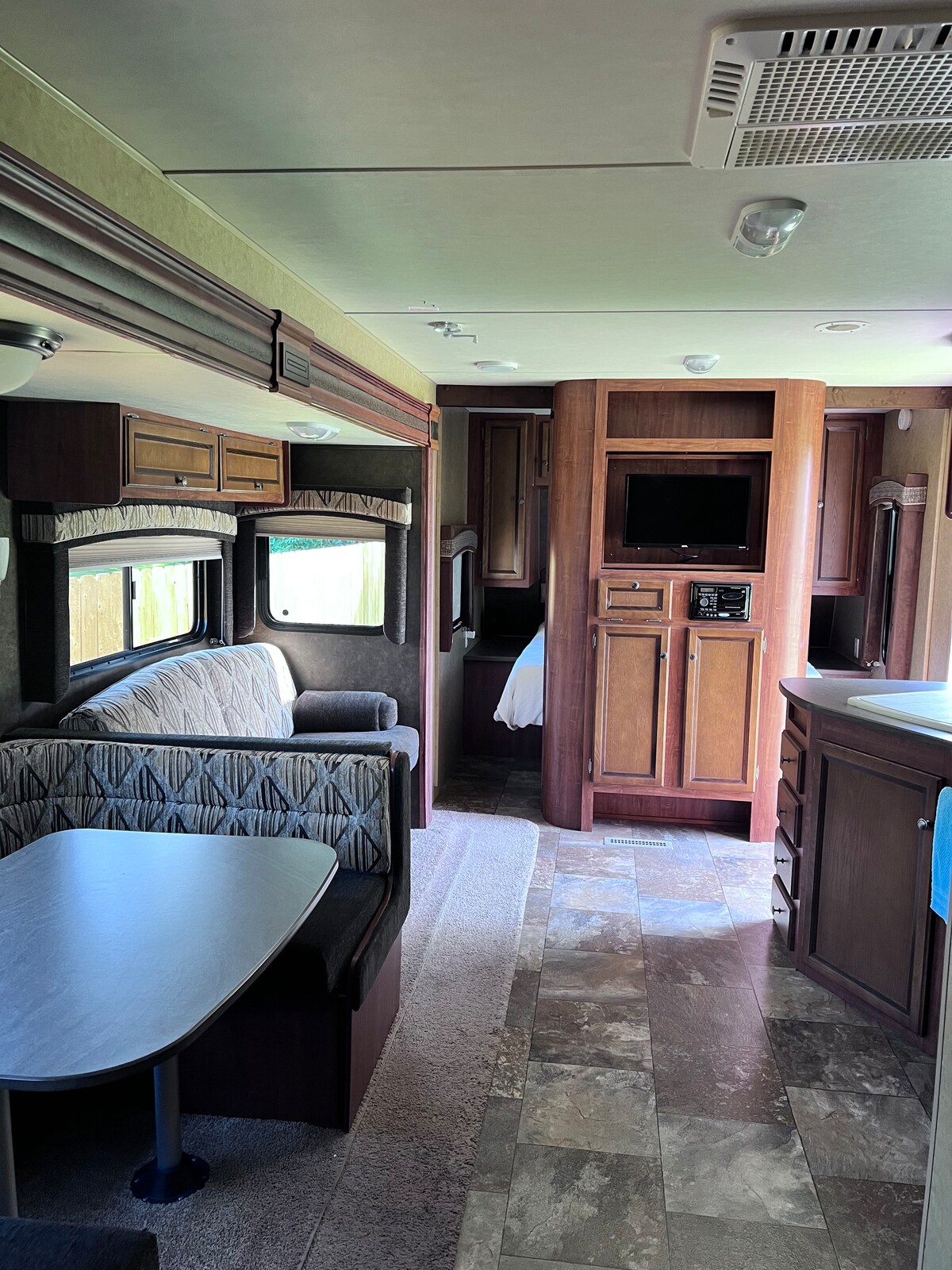 This is a great camper for groups/big families. This 37ft bunk house with 2 slide outs is spacious as they come. Manufactures says sleep 9 but that’s up to you. It has a queen bed with a dedicated small work space bedroom, a back bedroom with the possibility of 4 bunks, a couch that’s pulls out into a bed and the table turns into a bed as well. FULL SIZE fridge. Plenty of room to freeze your catch.