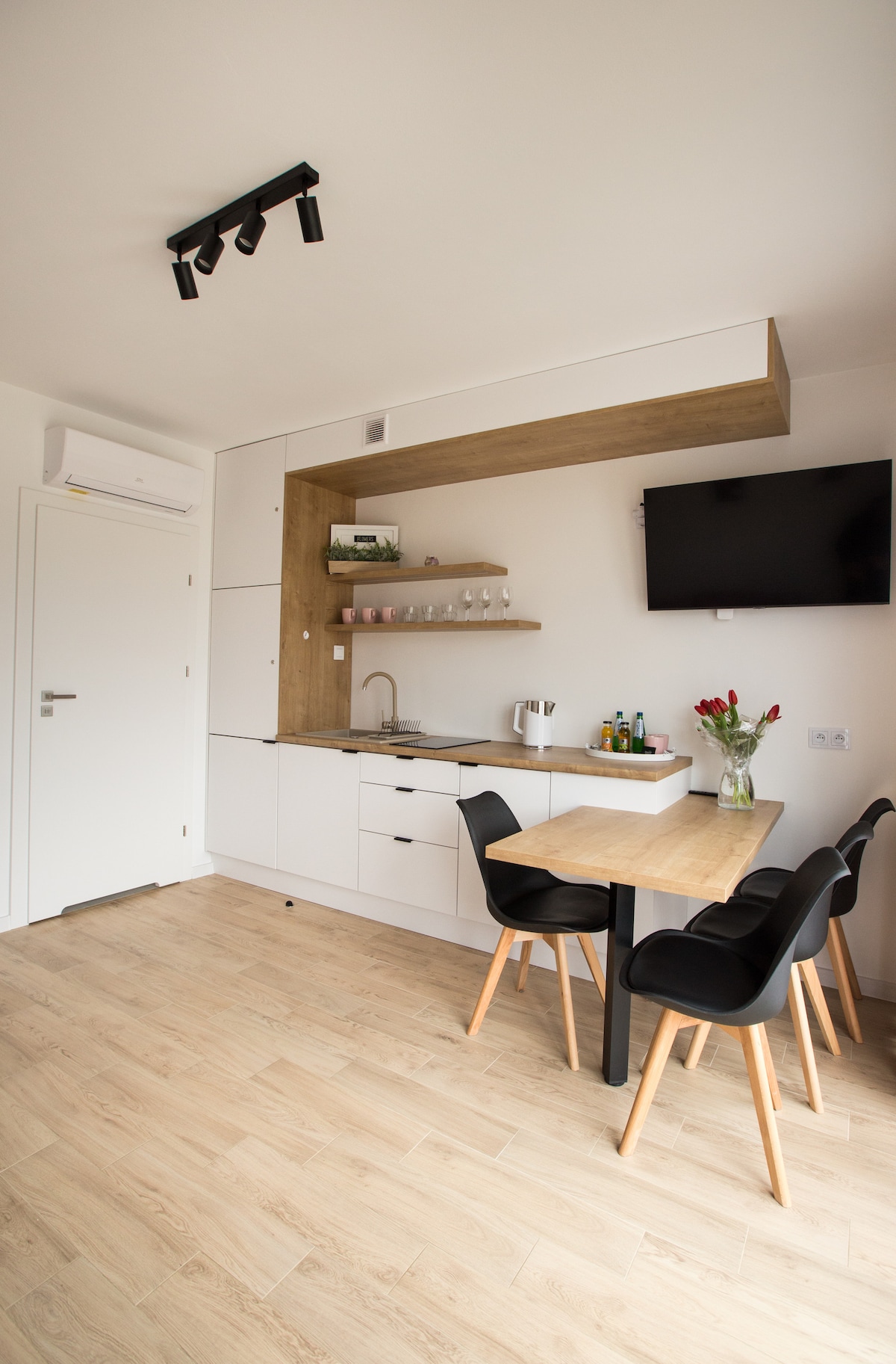 Apartamento tipo estudio con cocina americana , moderno y espacioso. Superficie total de 28 metros cuadrados. Equipada con dos camas individuales que se pueden combinar en una cama doble y un sofá individual. Televisor inteligente grande e internet inalámbrico. Un baño con ducha. Directamente desde el departamento se puede caminar hasta una amplia terraza. Estacionamiento gratuito. Check-in sin llave al departamento para obtener los códigos.