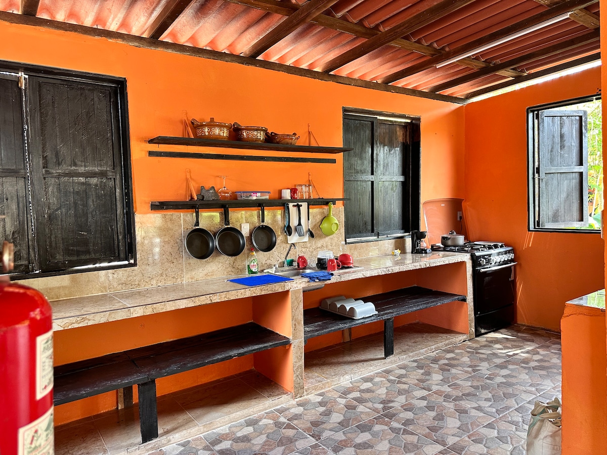 Departamento con entrada independiente dentro de una casa de campo, rodeada de árboles y animales de campo (gallinas y 4 perros). La habitación cuenta con una cama king size, hamaca, baño privado, TV con Roku, AA, internet y cocina propia con estufa, cafetera, refrigerador, licuadora y trastes. El espacio se encuentra a pocos metros de la laguna y de la terminal de autobuses (ADO). La propiedad es completamente segura y cuenta con un área amplia de jardín y estacionamiento.