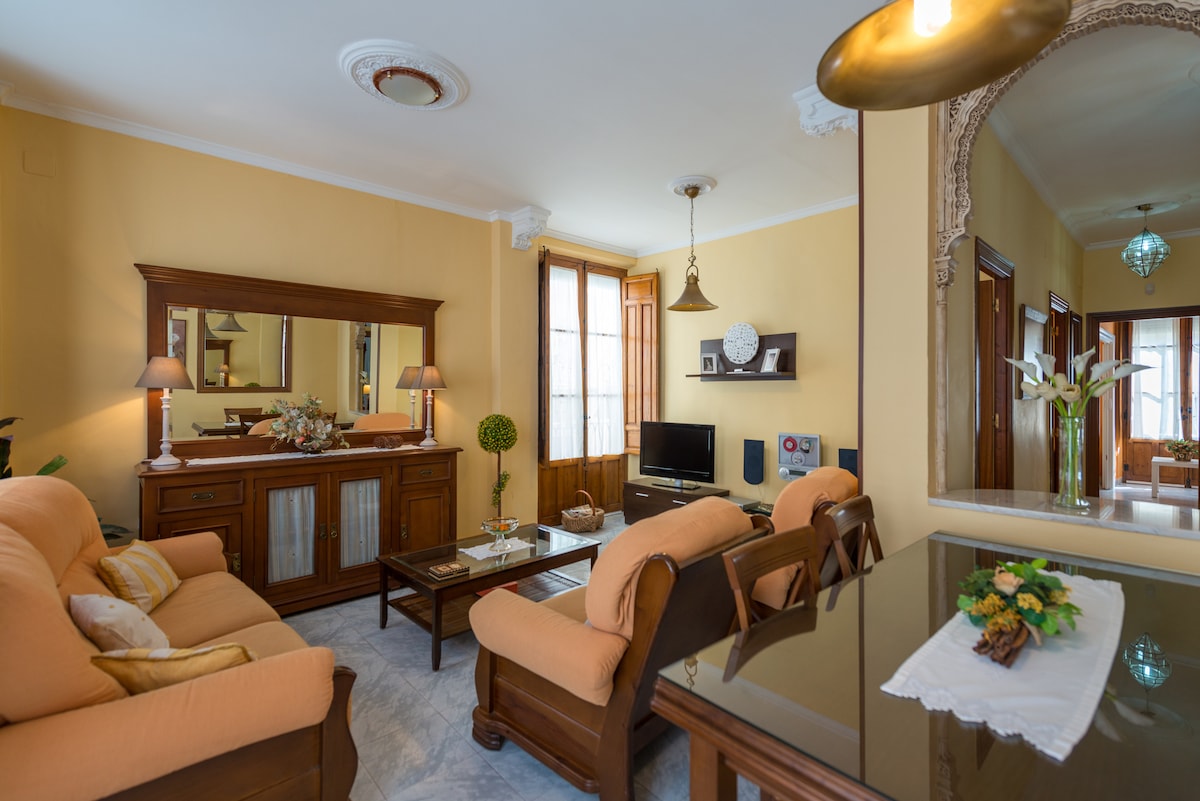 Gran apartamento en pleno centro histórico de Granada. Dispone de aire acondicionado y calefacción las 24 horas. El piso es exterior a 3 calles. Gran Apartamento max. 6 personas. Tiene de todo, lavadora,secadora, lavavajillas, todo el menaje de la cocina, TV,wifi, etc. Cuna y trona para bebe. Calefaccion y aire acondicionad. Parking economico a 40 metros del gran apartamento. Hay cuna bebe. Desinfección con Generador Ozono 50 gramos y productos de acorde a la OMS y Airbnb.