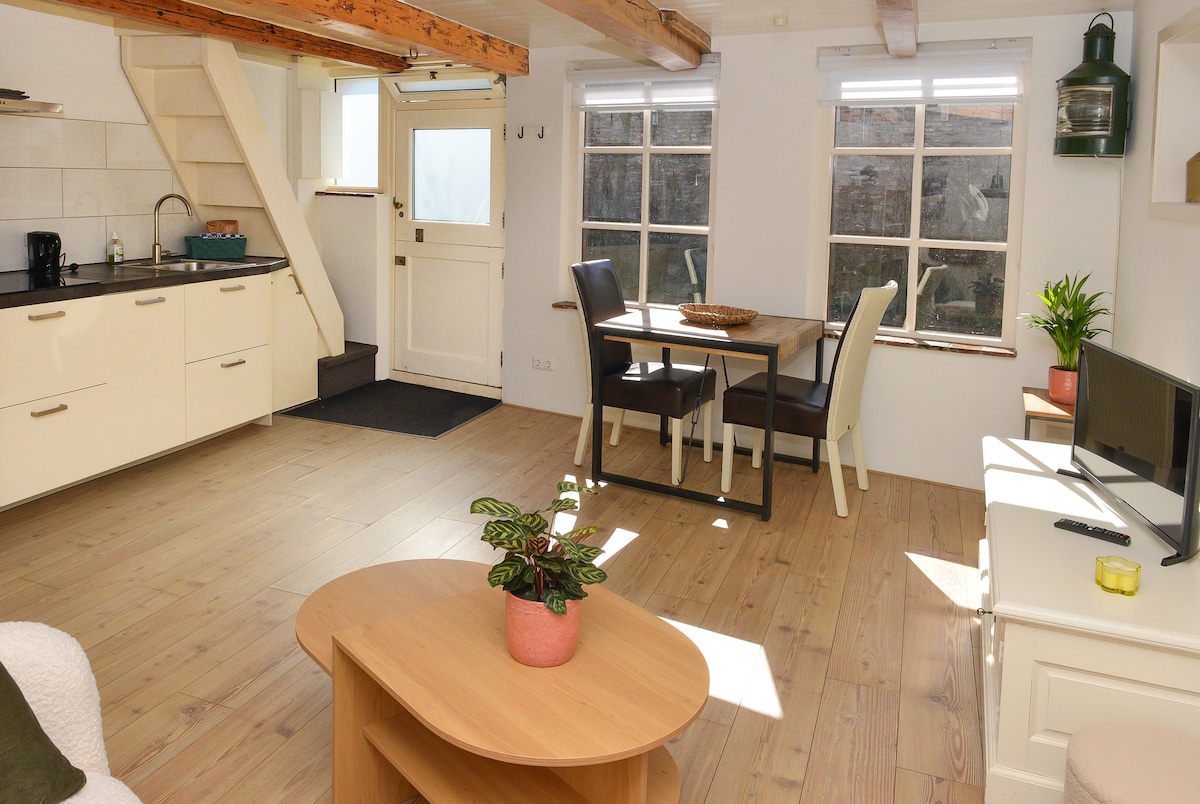 Relax and unwind in this peaceful, mid-century inspired vacation studio. A lovely studio with a spacious living room, private (separate) bathroom, sleeping loft (note: narrow steep staircase) and private outdoor terrace with seating and parasol. The studio has a spacious kitchen counter with various kitchen facilities. The studio is remarkably light through the many windows. Please note: due to the narrow and steep stairs to the sleeping loft, it is not suitable for the elderly or disabled.