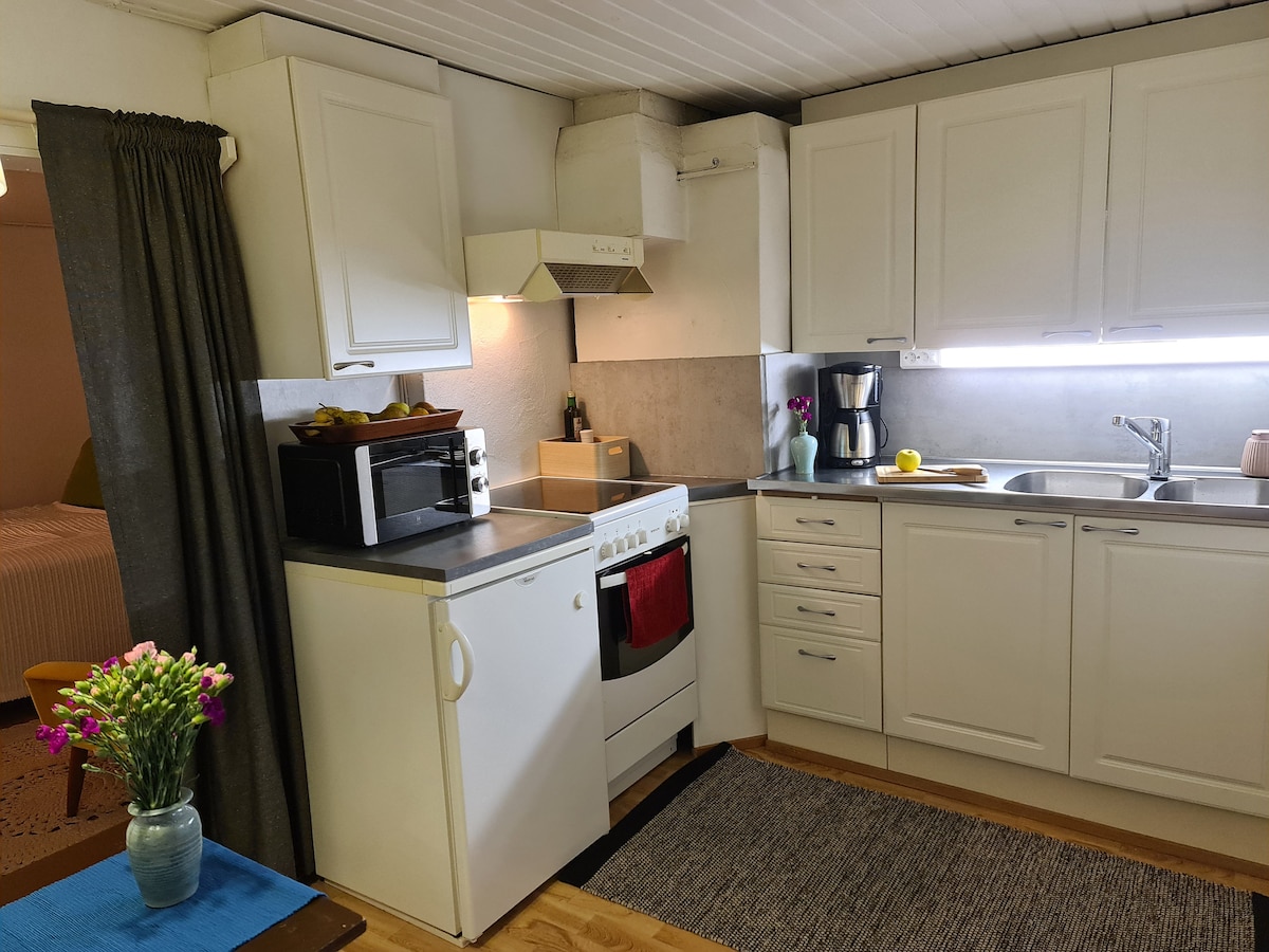 Esta casa de campo única de más de 100 años se encuentra en una zona residencial tranquila a solo unos kilómetros del centro de la ciudad. Está cerca de la autopista E4. La siguiente parada de autobús y un supermercado se pueden encontrar en las inmediaciones. Las bicicletas se pueden alquilar por una tarifa adicional. La cabaña es adecuada para 2 personas y ofrece una sala de estar/dormitorio, una cocina totalmente equipada y un baño con ducha y lavadora. La casa se puede calentar con calentadores eléctricos, una bomba de calor o un horno de leña.