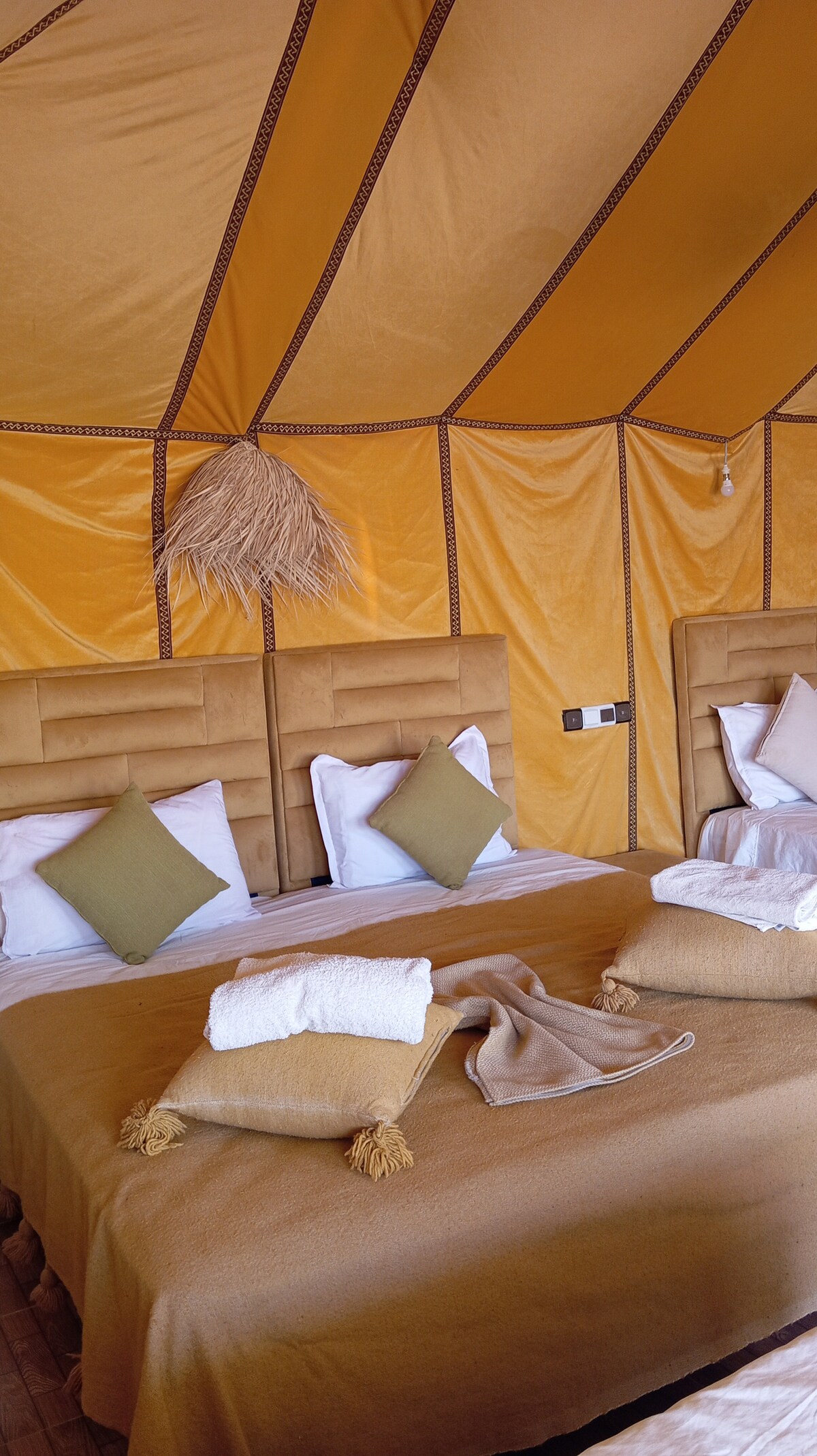 Vivo junto con mi familia en las afueras de Hassilabied, un pueblo a pocos kilómetros de Merzouga. Tenemos una casa tradicional sencilla con una habitación privada disponible para que dejes tus maletas y te lleves solo una pequeña mochila para el desierto. Pero ambas habitaciones se comparten con otros huéspedes, ¡y nos encantaría compartir nuestra hospitalidad marroquí contigo! Tenemos una casa de huéspedes, y campamento en el desierto, y paseos en camello. Te ofrecemos 2 campamentos en el desierto diferentes, estándar y de lujo. Tienen precios diferentes.