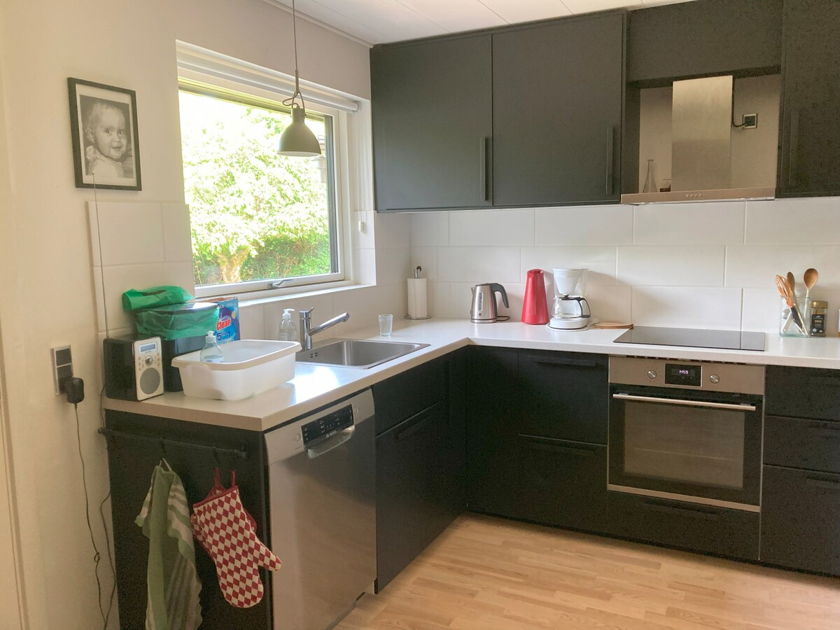 WATERFRONT APARTMENT, BEATYFULLY LOCATED – CLOSE TO ODENSE CENTER - Free parking and bikes available. Located above the ground floor and is done in a personalized scandinavian style with calm colors and a lot of light. Private entrance from a staircase/balcony, view to forest and water. The apartment is fully furnished. Two bedrooms, spacious bathroom and a integrated kitchen/ living room. We live in the ground floor and are reachable at any time. City center is a ten minutes bike ride away.
