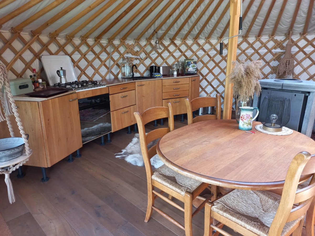 Ven y disfruta de esta hermosa yurta que bordea un prado de poni y tiene vistas a un huerto de manzanos. Marijke ha decorado esta yurta con mucho amor y atención. Silencio, espacio, libertad y creatividad. ¡Eso es lo que exuda el lugar! La estufa de leña y la acogedora decoración crean una atmósfera romántica e íntima. La yurta se encuentra en un área recreativa a pequeña escala, cerca del Waal y del lago recreativo de Groene Heuvels. Cerca podrás ir a pie y disfrutar del paisaje verde.