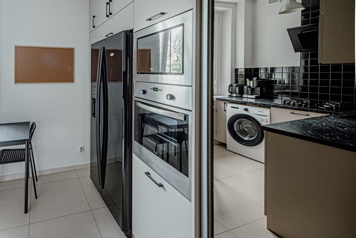 Nuevo apartamento de estilo moderno para 4 personas máx. (cama doble, sofá plegable). La cocina incluye lavavajillas, nevera, congelador, horno, cocina de inducción y hervidor eléctrico. TV, wifi. El baño tiene secador de pelo y lavadora. El apartamento está ubicado en la calle Ogrodowa 4, en el centro de la ciudad de Lodz. A 300 metros del centro comercial Manufaktura con aparcamiento gratuito las 24 horas. A 400 metros de la calle principal Piotrkowska. Cerca de la casa hay una tienda Zhabka, cafetería, restaurante, cine i-max.