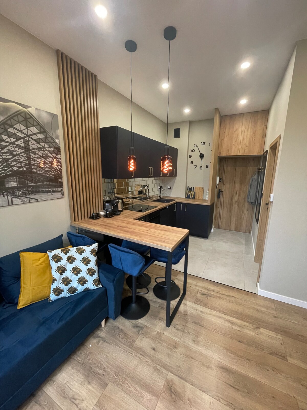 Un departamento tipo loft con estilo en el corazón de la ciudad. Un dormitorio acristalado, un mural de diseño con grullas y un cómodo sofá crean un ambiente único. Una cocina totalmente equipada, un baño moderno con ducha a ras de suelo e internet de alta velocidad garantizan la comodidad tanto para una estancia corta como para un viaje más largo. Ideal para parejas, viajeros solitarios y trabajadores remotos. Ubicado cerca de restaurantes, tiendas y lugares de interés.