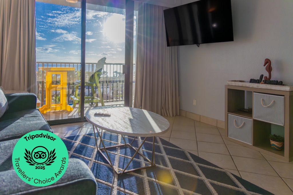 The Isla Grand Beach Resort condo features views of our pools, along with beach views. Condo #305 rooms accommodate up to 6-ppl with 1-king bed, and 2 twin beds in the second unit, and a sofa sleeper in the living room Our Condo unit Features: 2 Balconies 3 Televisions with 74- Spectrum channels Sleeper Sofas in selective rooms (included) Iron and Ironing Board Hairdryer Full size refrigerator Full size kitchen Free Wireless Internet Digital In-Room Safe at this cheerful getaway.