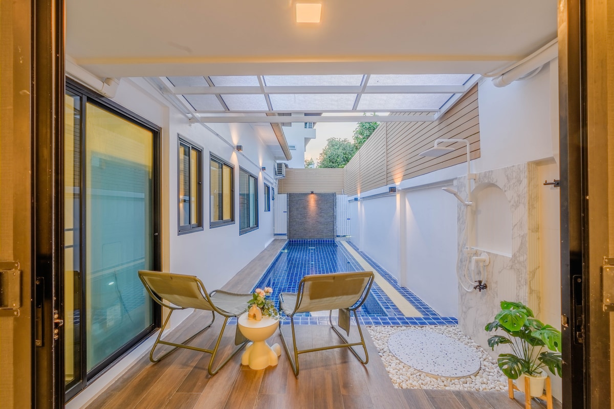 Escape the Bangkok buzz in a private tropical sanctuary. This Sukhumvit gem features a saltwater pool & 75" Home Cinema—perfect for a quiet family workation, just 400m (5-min walk) to Bangchak BTS (E10). WHY BOOK THIS VILLA: ✅ PRIVATE POOL: Saltwater system in a secluded courtyard. ✅ Dedicated kids' corner ✅ WORK-READY: Fiber-optic Wi-Fi for Digital Nomads. ✅ TRAVEL EASY: Free luggage storage (Pre & Post stay). ✅ SEAMLESS: 24/7 Self Check-in & Van Rental options. ✅ SPACE: 4 BRs for 8-12 guests.