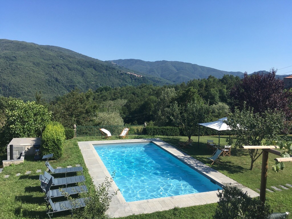 Hermosa casa con vistas espectaculares y piscina infinita. Muy privada, sin otros huéspedes ni compartir nada. Esto es de otro mundo. Villa Vetteglia está construida en la cima de una colina, las vistas son verdaderamente de 360 grados. 3 camas y 3 baños (las camas 7/8 están en una cómoda cama plegable en el salón). La ubicación es privada y remota, pero cerca de Lucca, Pisa y Florencia. Bagni di Lucca (para ir de compras) está a 7 km. Acerca de la ubicación, está en una carretera de montaña asfaltada, pero mira las fotos antes de hacer una reserva :)