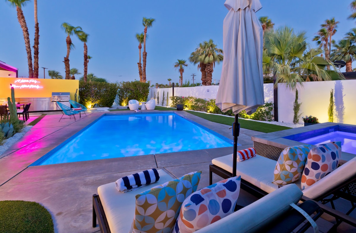 Entre el 5 % de los alojamientos más populares y «FAVORITO DE LOS HUÉSPEDES» según Airbnb. Esta maravilla de 3 años te espera en el codiciado enclave de The Mesa, a pocos minutos de lo mejor del centro de P.S. La casa inspirada en la década de 1950 tiene 3 dormitorios, 3 baños en suite, techos de 14 pies, puertas corredizas de vidrio, electrodomésticos Bosch, arte de grado de exposición, garaje para 2 autos, sala de estar hundida, fogata, sofá al aire libre/comedor, piscina de agua salada y jacuzzi. Ofrece mucho estilo, elegancia y privacidad. Lo opera un propietario local de 5⭐️.