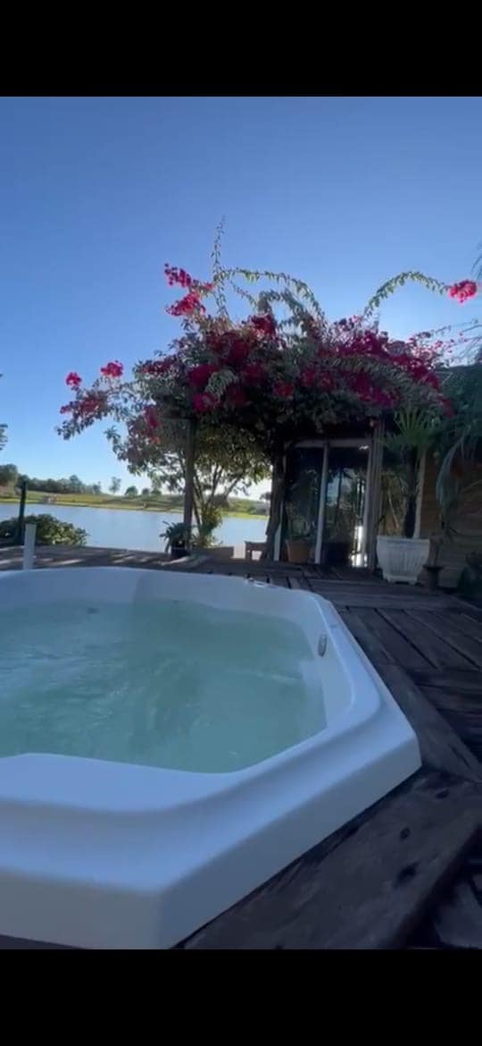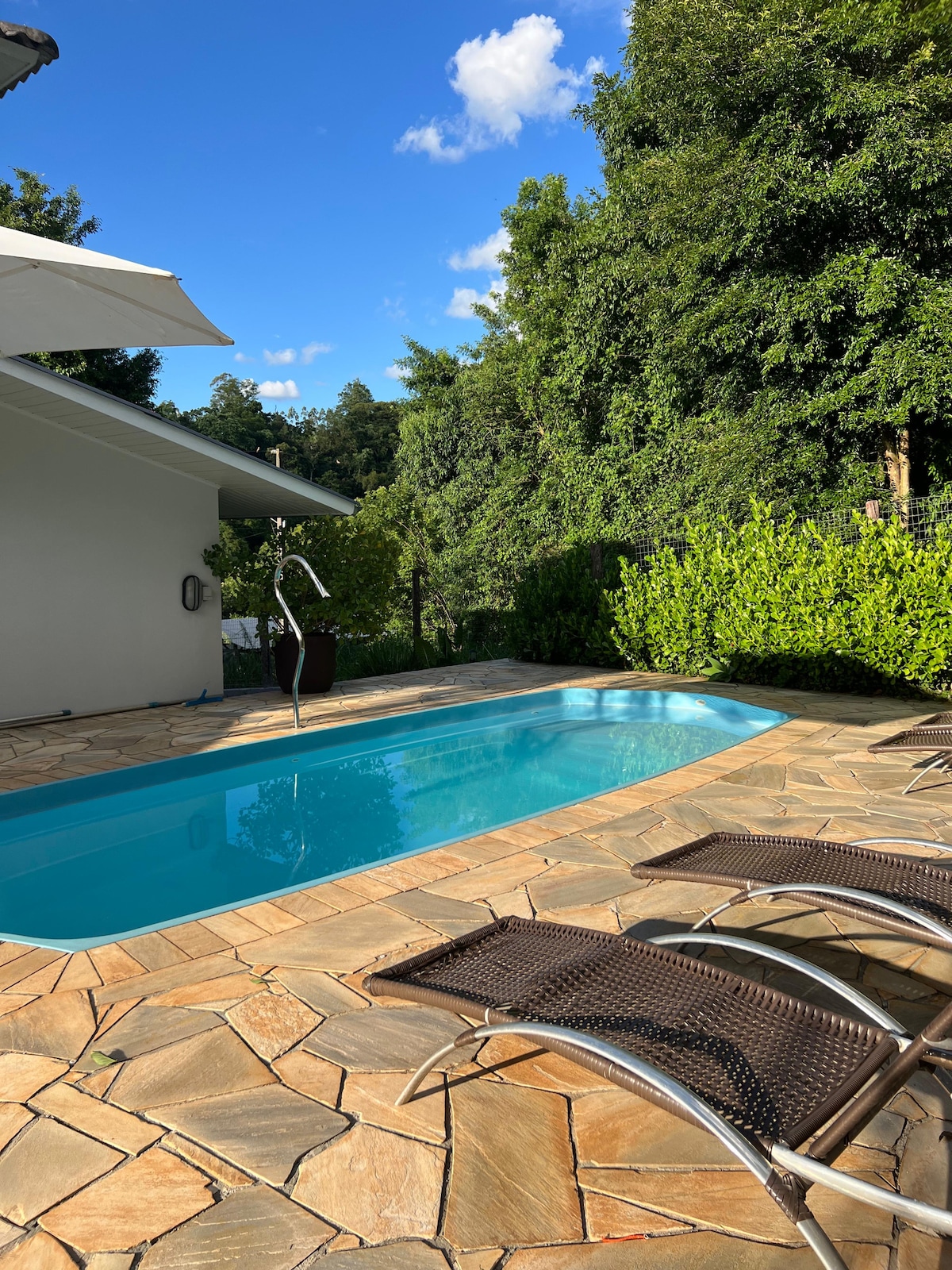 Casa junto a la naturaleza con un ambiente cálido y acogedor, a 300 metros del centro comercial de Pedras y a 500 metros de Vinicula Ametista. Casa con baño social, dormitorio con aire acondicionado y cama queen, y un dormitorio secundario con ventilador de techo, cama queen y TV. Amplia sala de estar con chimenea, sofá cama, TV y cocina. En el balcón hay una sala de juegos y un lugar con parrilla. En el exterior hay un gran espacio con piscina, baño, terraza de madera y perrera cubierta. Señal de Wifi.
