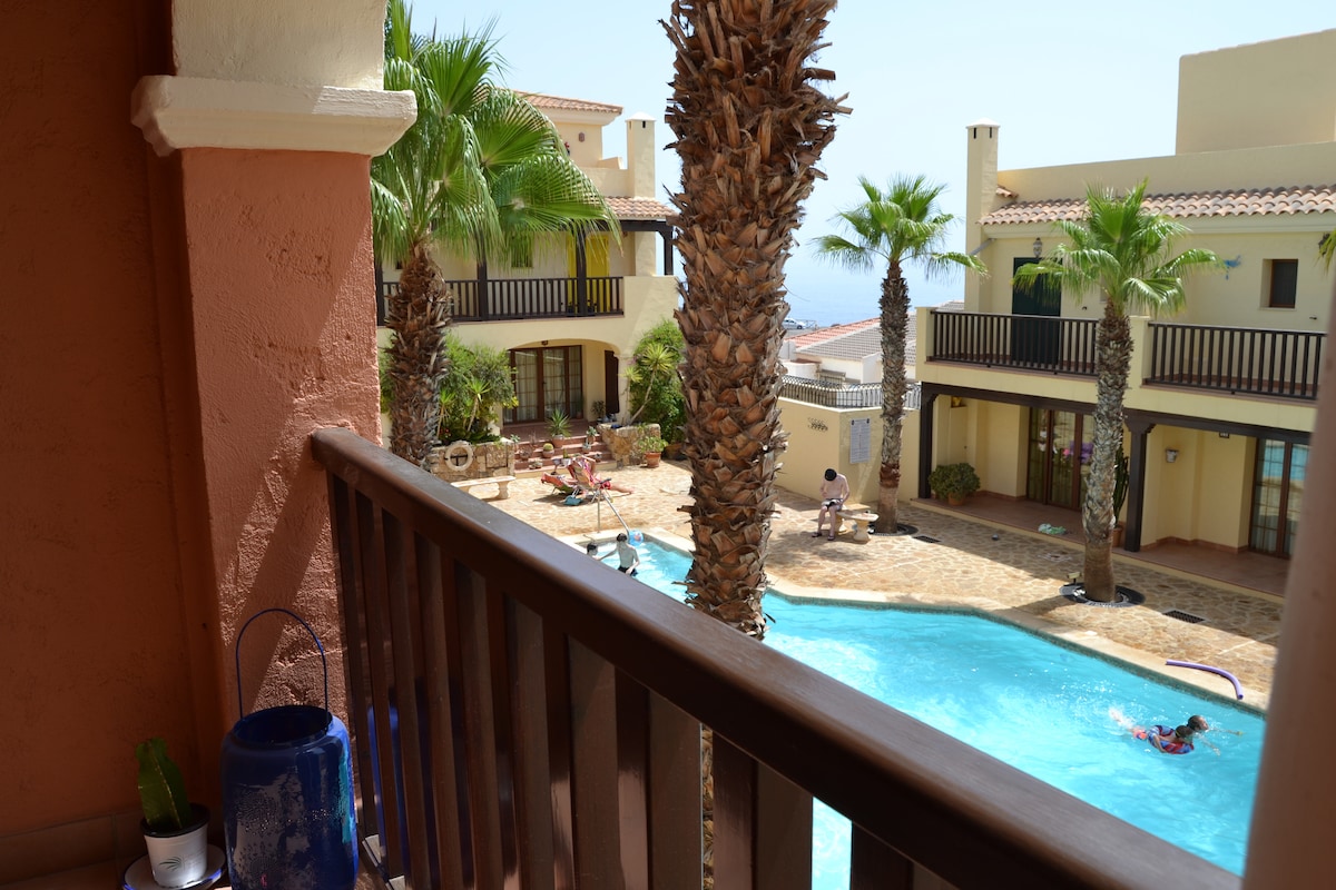 The perfect place to relax and enjoy. The apartment is located on top of a hill and a 5-10 min walk from te beach and the boulevard with all restaurants and bars. The air bnb has a huge terrace (70m2) with a roofed dining area, lounge and a barbecue. The views are spectacular. You will live between the mountains with a fantastic pool- and seaview. Inside we have all equipment and service you need. Mojácar and it's surroundings has a lot to offer.