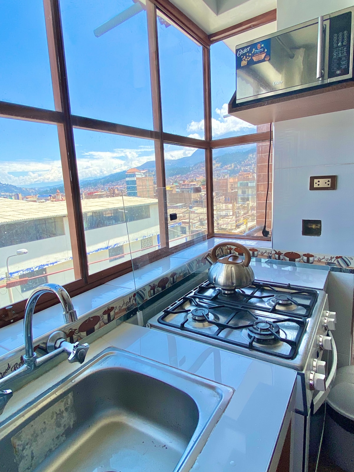 Apartamento con un paisaje único cerca a la iglesia de La Soledad, ubicación céntrica, tranquila y segura, tendrás fácil acceso a bodegas, restaurantes, cafeterías. Y llegarás en 10 min caminando a la plaza de armas. Cuentas con kitchenette, balcón a la calle, Wifi, TV Smart 50", baño con ducha, agua caliente en la ducha y lava trastes de cocina, menajeria, microondas y nevera. Perfecto para estadías largas. Tip: Pregunta por la disponibilidad de cochera gratuita