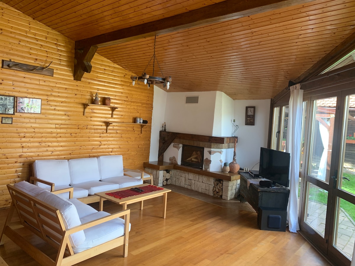 Welcome to our cozy wooden A-frame cabin, nestled in beautiful mountains. Enjoy the peace of nature with a river and lush forests a short walk away, plus a large children's playground nearby. Stay close to the lively village while savoring the quiet countryside, with friendly horses, cows, and sheep passing by. Your perfect getaway awaits!