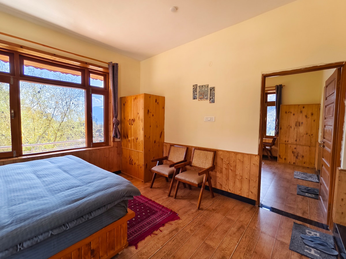 Luxurious traditional-style 2 Room set in Haripur, Manali, with a 360° unrestricted mountain view and tranquility. ✨ Highlights: 🚗 Spacious Parking 🍀 Restaurants, Waterfall, Bank, ATM, Gym nearby 🍀 Veg, Vegan and Jain food friendly property. 🏡 Cozy & Comfortable Ambiance With Full Tower 5G Coverage 🚿 1 Attached Washroom with Hot Shower 📺 Jio AirFiber (100 mbps with backup) 🌲 Surrounded by Nature More than just a stay, our space is a tribute to the earth