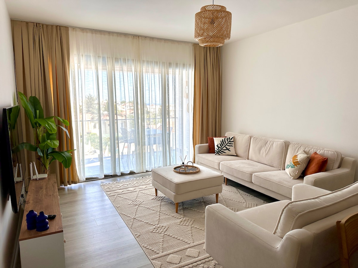 Cosy studio at Palm Beach gated complex just accross the beach with a big swimming pool, tennis court, huge garden a barbecue area, free parking and amazing patio view. All essential kitchen appliances available as well as smart TV & WiFi 200mb Superb location closed to all amenities, bakery, supermarkets, restaurants, cinema, famous beach bars & night clubs. Bus coastal line available to the historical center and beach locations. The studio has been recently redecorated and looks stunning.