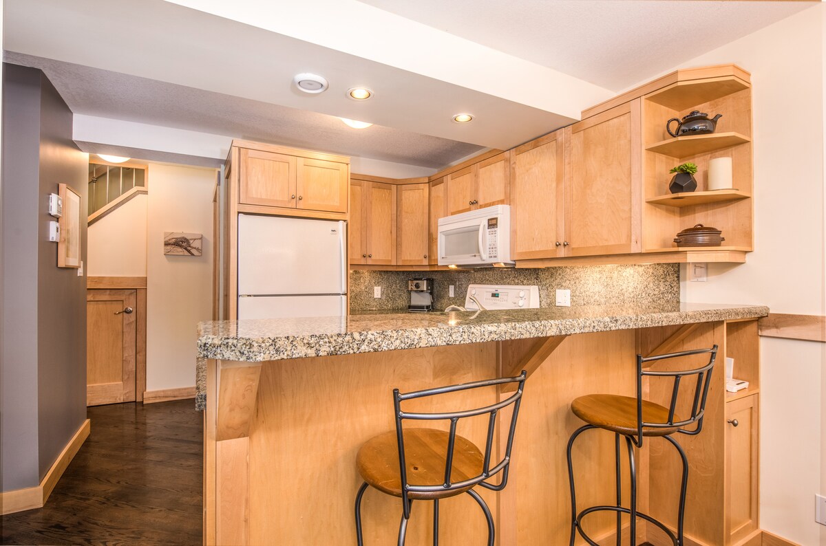 Esquí hasta tu puerta. Centro vacacional de 4 temporadas. Estaciona bajo tierra, ve tu auto cuando te vayas. telesilla a pocos pasos. planta baja, salida, patio privado en un cinturón verde. 2 camas queen + salida. No hay alfombras. Suelo climatizado en el baño. Armario de esquí y cocina equipada. Barbacoa. Camina por tu bata de baño hasta las bañeras de hidromasaje. Tienda general detrás de nuestro condominio. Wifi gratuito. Los huéspedes pueden: esquiar (descenso/campo traviesa), nadar, vehículos todoterreno, esquí en helicóptero, golf, tenis, ciclismo de montaña, caminar/senderismo rodeados por las Montañas Rocosas.