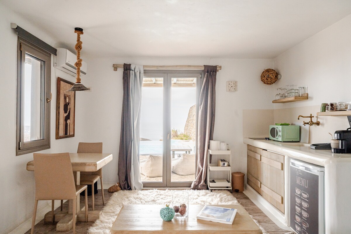 Lujosa suite de 39 m² + patio de 45 m² con piscina privada, jacuzzi exterior para 3 y vistas panorámicas al mar. Incluye cama tamaño queen con colchón anatómico, sofá de plumas de ganso (para 1 persona más), cocina completa, televisor inteligente SAMSUNG de 55" con Netflix gratuito y sistema de sonido Bluetooth Hi-Fi SONY. Amplia terraza amueblada con comedor al aire libre y estilo cicládico. Disfruta de total privacidad, comodidad de 5 estrellas y servicio de conserjería. Ideal para parejas o familias pequeñas que buscan una escapada única, elegante, privada y extraordinaria a Mykonos.