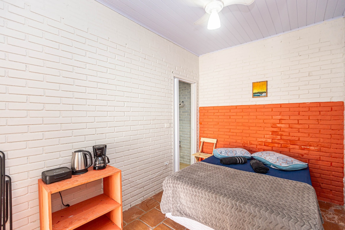 Relaxe neste lugar único e tranquilo a apenas 160 metros da praia. ☀️🏖️🌊 Suite com cama casal, roupa de cama, ventilador no teto, banheiro exclusivo, frigobar, cafeteira, sanduicheira, chaleira elétrica, espaço para refeições e rede. Check-in e check-out flexíveis! Consulte disponibilidade! Check-out mais tarde no domingo de cortesia!