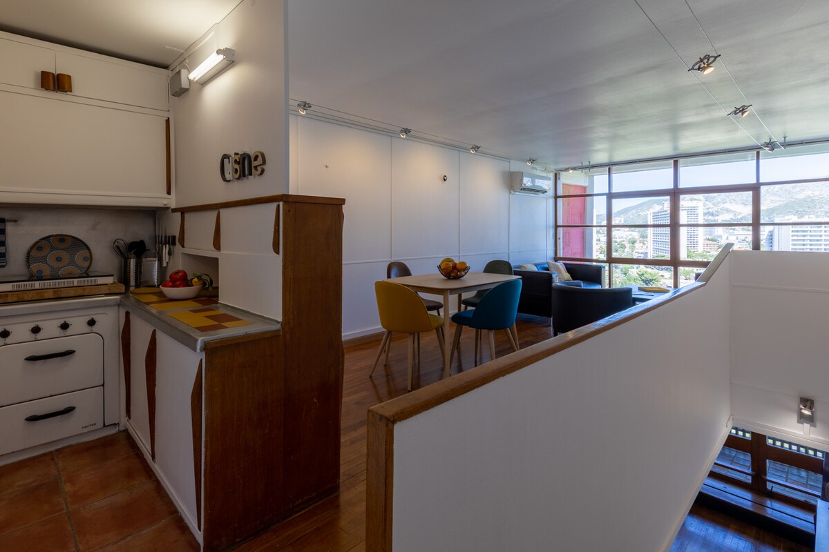 Disfrute de una estancia inolvidable en este alojamiento único. Lujoso dúplex Le Corbusier ciudad radiante. Terraza- logia con impresionantes vistas al mar desde el séptimo piso (último piso) Totalmente original muy raro sin transformar Incluye todos los muebles, incluida la cocina Perriand que está completa. Apartamento excepcional con muebles únicos de Charlotte Perriand.