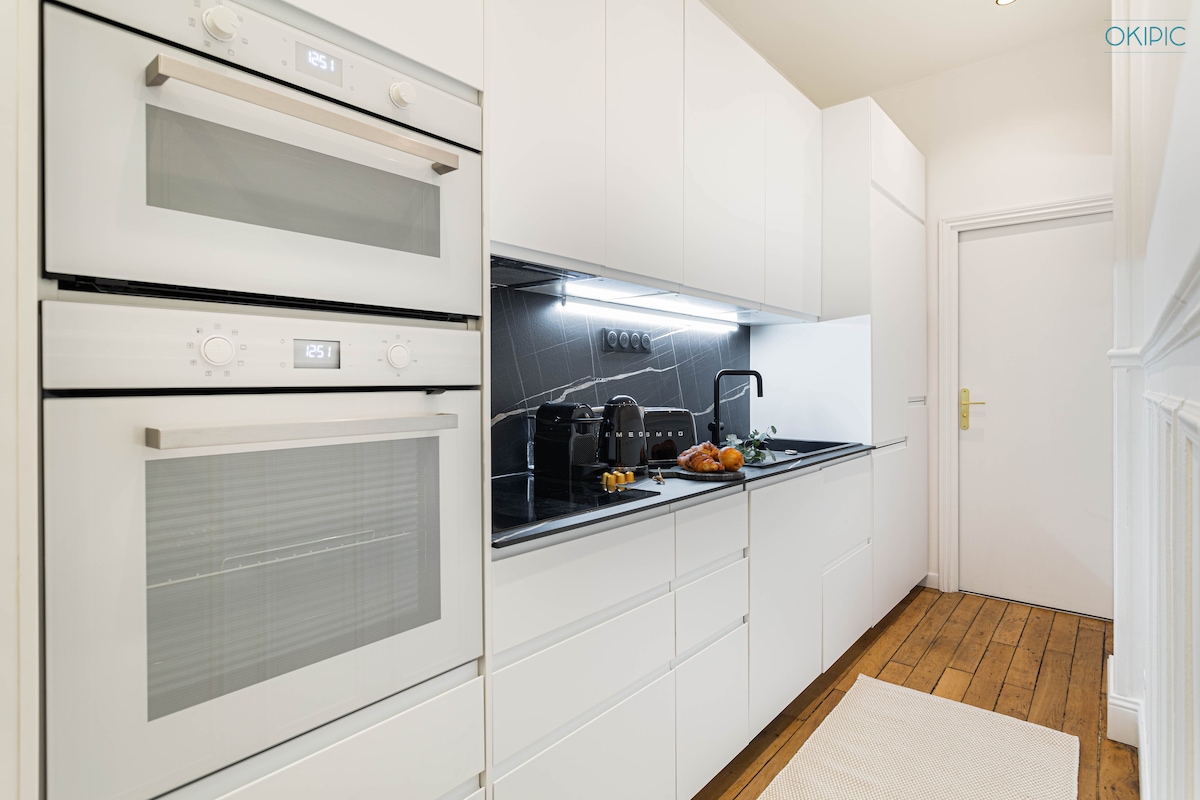 Apartamento de lujo renovado en París 17, entre Monceau y Batignolles. Luminoso, tranquilo y elegante, con techos altos, parqué en espiga y acabados de calidad. • Cama tamaño queen + sofá cama • Cocina totalmente equipada con barra de mármol • Ducha italiana a ras del suelo Una auténtica sensación de hotel boutique en una zona muy solicitada. Perfecto para parejas, familias o estancias de negocios. Wifi rápido y Smart TV incluidos.