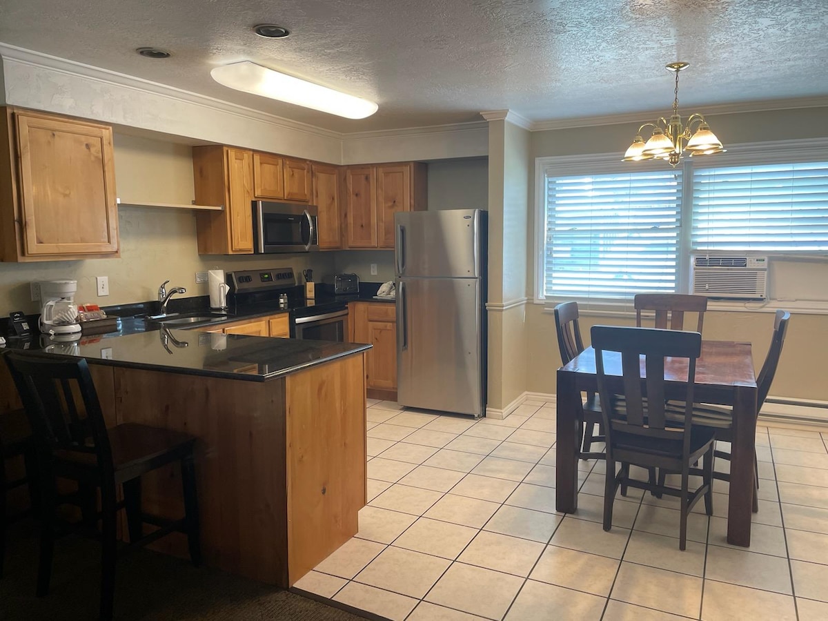 Situado en el corazón de la capital de la aventura de Utah, este apartamento es perfecto para parejas para un grupo pequeño que busca unas vacaciones llenas de actividad. Las habitaciones son amplias, contienen una cocina completa y/o una pequeña cocina y cuentan con servicio diario. Una selección de restaurantes dentro del complejo o a poca distancia en coche de la ciudad principal o alójate y cocina el tuyo, ¡la elección es tuya! El centro vacacional también cuenta con piscina cubierta/al aire libre, gimnasio, Serenity Spa y zona de sauna. ¡Elevadores en la puerta de tu casa con aparcacoches!